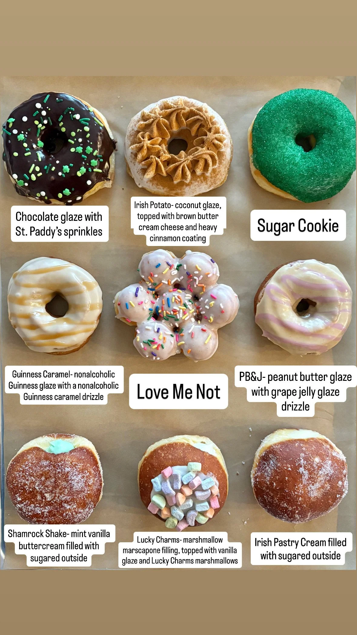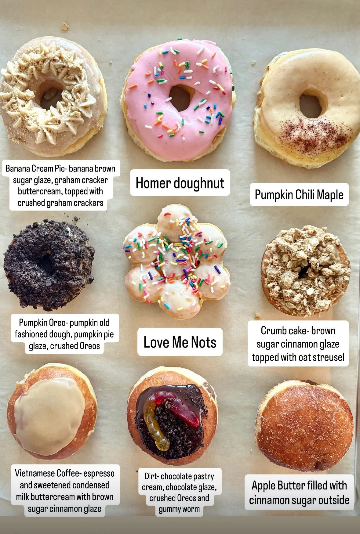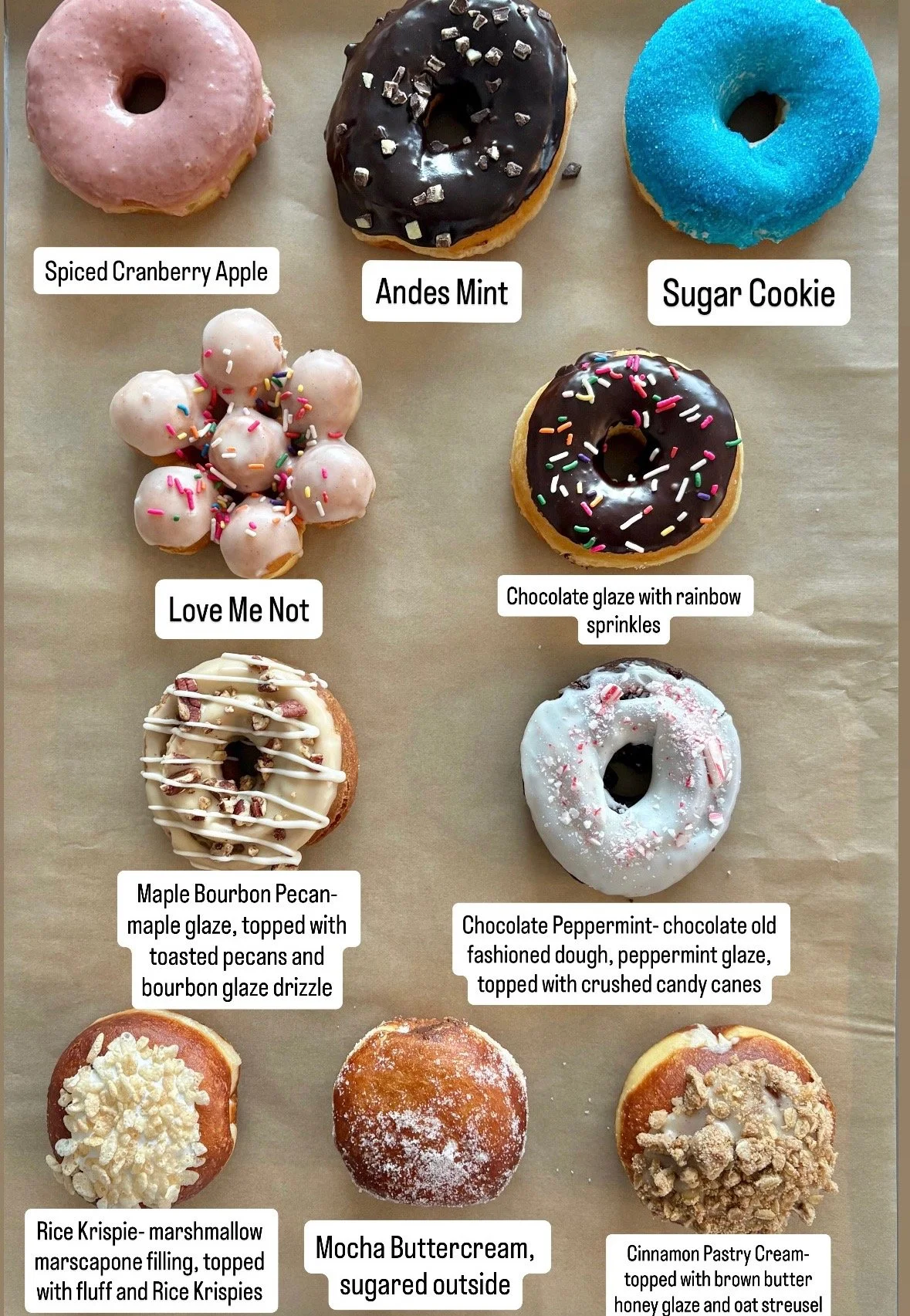 Check back here to see what we’ve got in store for you! Please email about any allergy concerns or questions. Instagram and Facebook are the best ways to find out all up to date information and whether or not we are low and sold out of doughnuts. (Posted in our stories.)